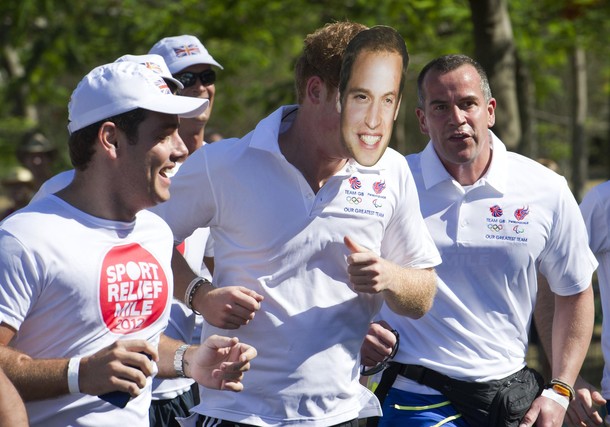 Britain’s Prince Harry takes part in a fun run while wearing a mask of his brother Prince William on Flamengo beach in Rio De Janeiro March 10, 2012. The prince is on a three-day official tour of Brazil on behalf of the British Foreign and Commonwealth Office. REUTERS/Arthur Edwards/POOL (BRAZIL – Tags: ROYALS ENTERTAINMENT SOCIETY SPORT ATHLETICS)