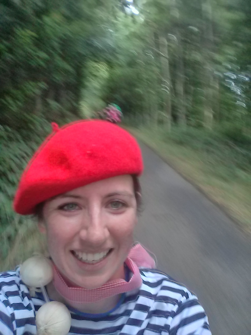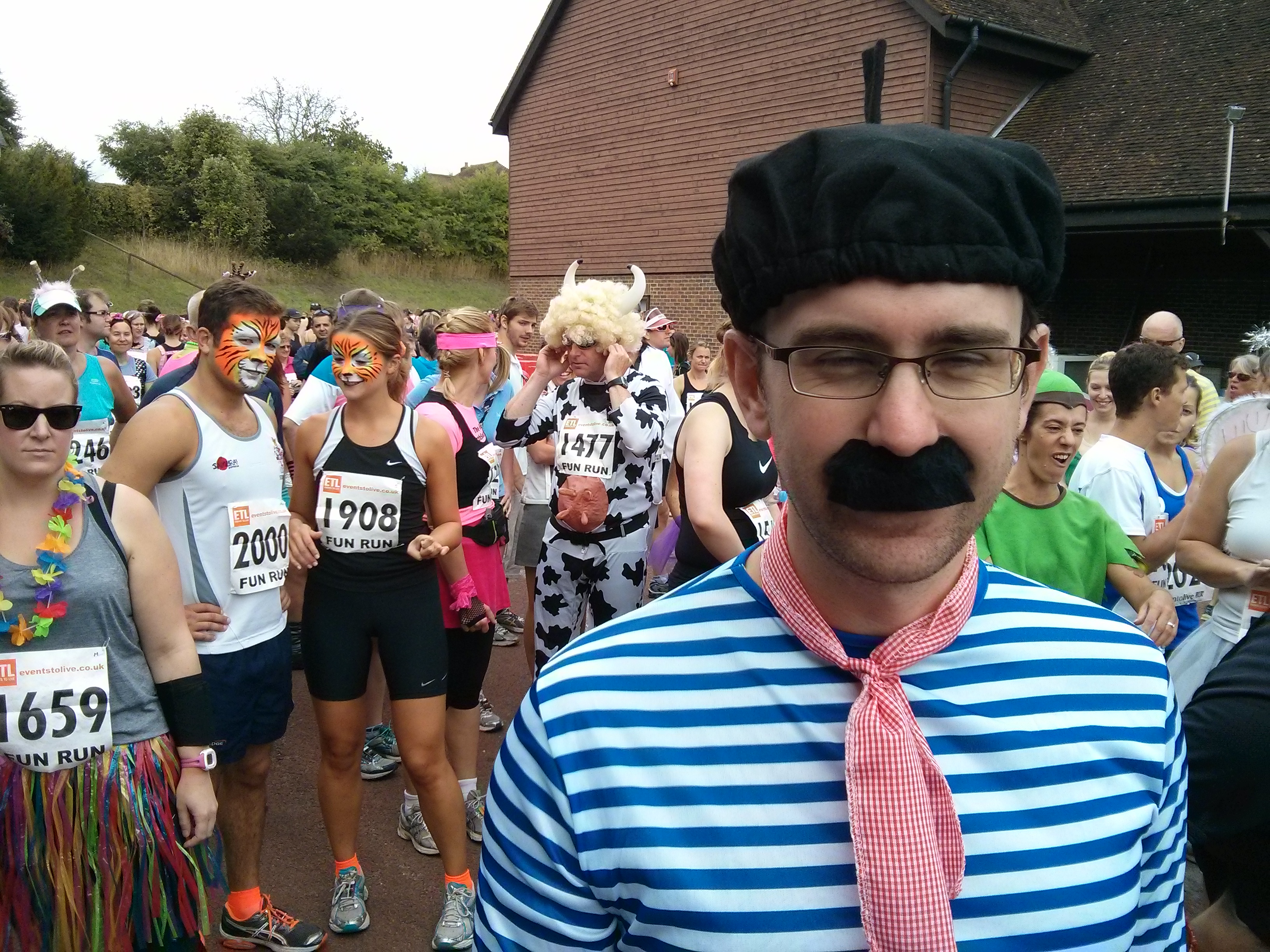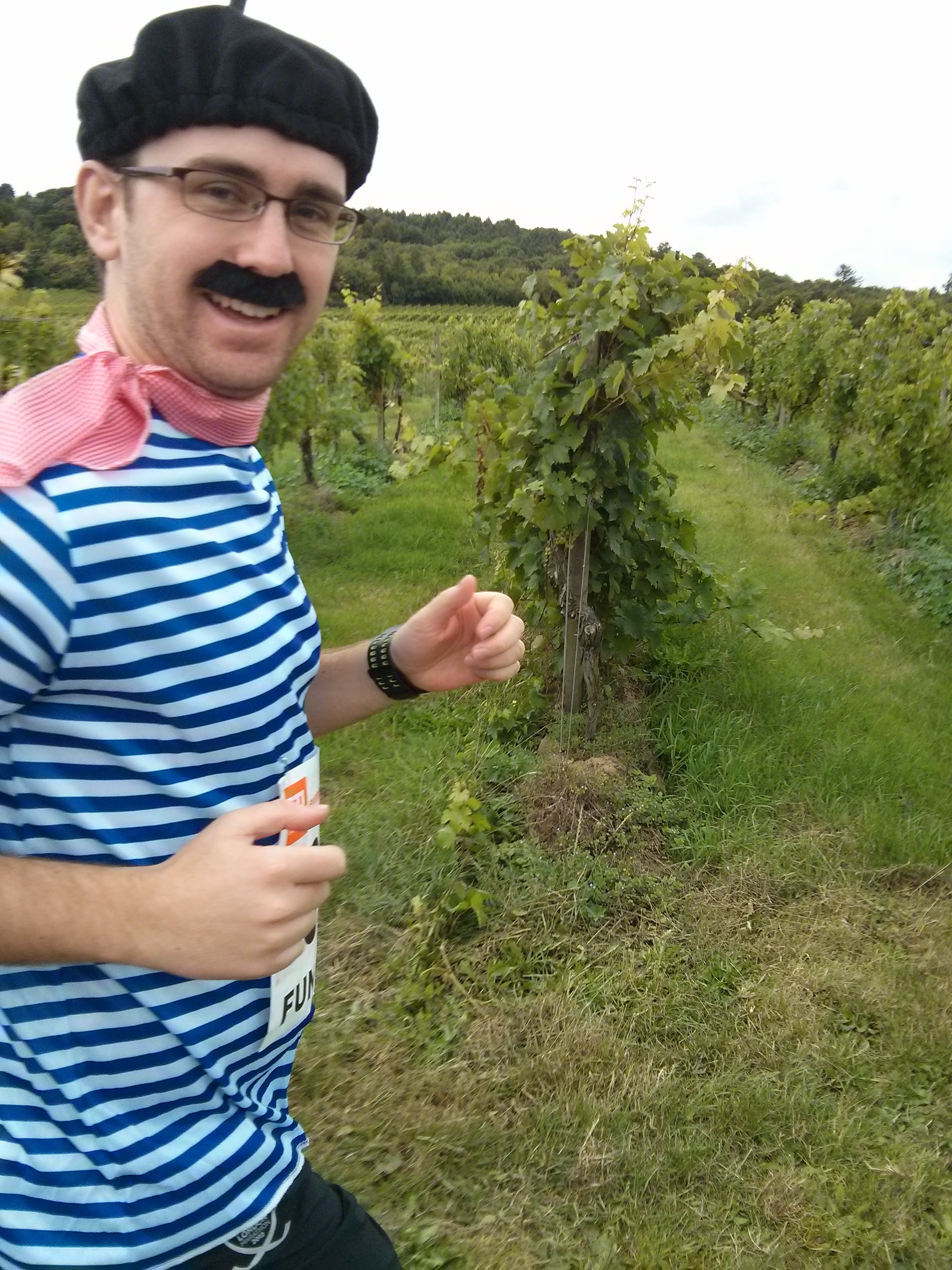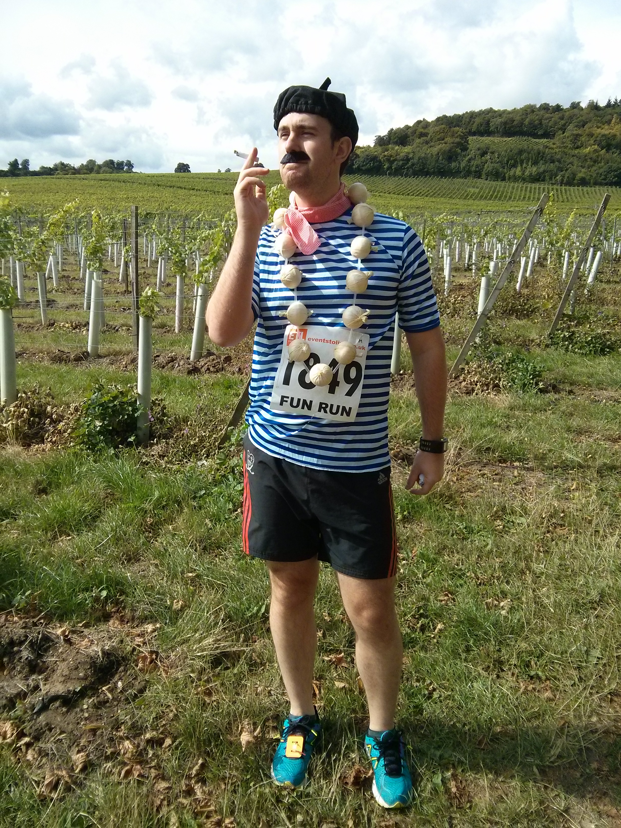 Alex and I were dressed up as Frenchmen in the spirit of drinking wine and running we figured we could use all the genetic help we could get. The moustaches stayed on for about 5 minutes but the rest of the costume performed well over the race. Smoking and running isn’ the best idea, but couldn’t resist the photo opp.