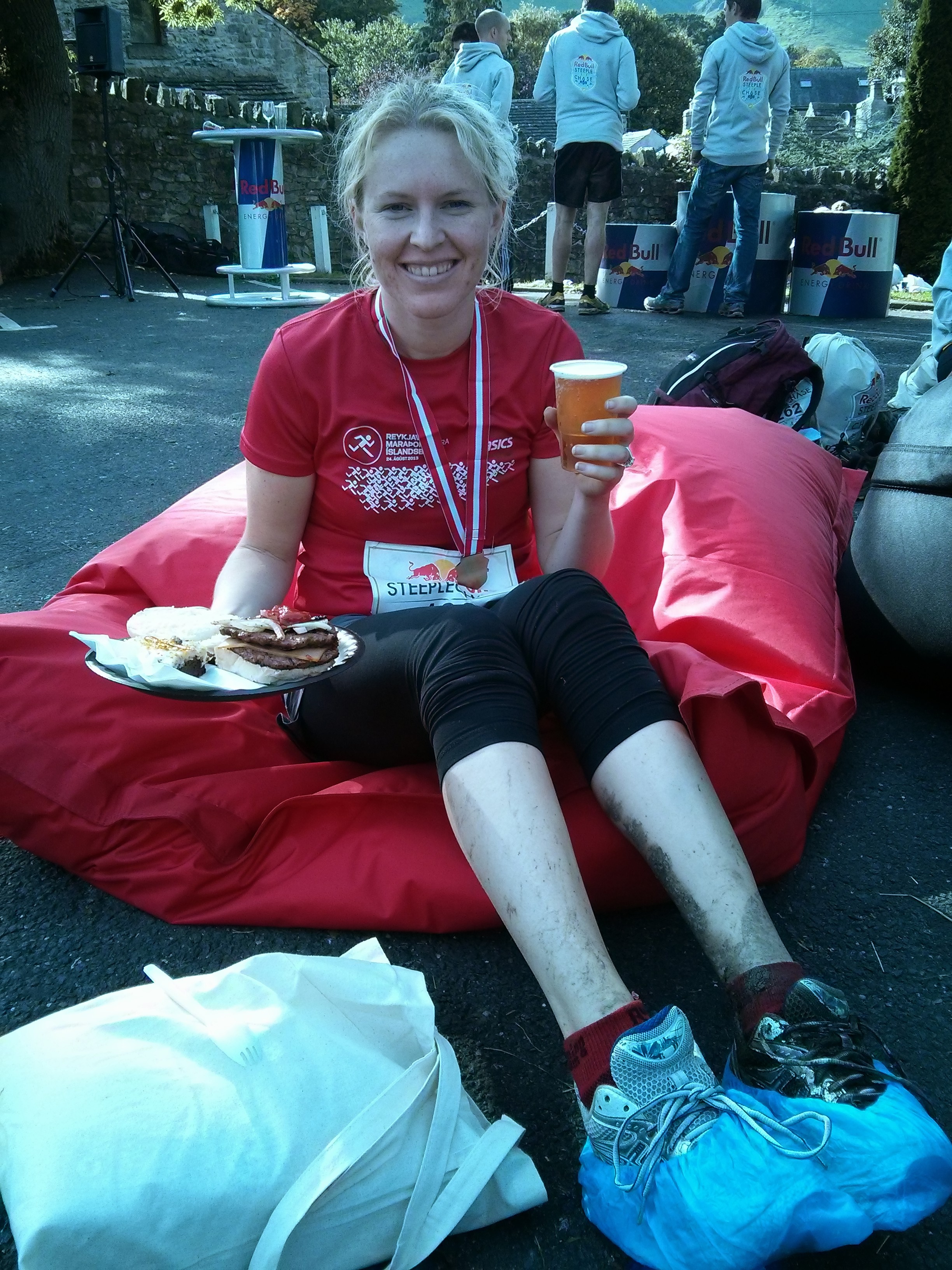 Our friend Callum was very reasonable and made it to the first steeple then caught the bus back from there, so he had grabbed us a great beanbag spot in the sun and a few drinks were waiting for us on arrival. I grabbed a double cheeseburger and a hog roast with stuffing for lunch and a cider to wash it all down. Race recovery at its finest. As we ate the church bells were ringing as each of the 20 finishers came through. The same woman won it as last year, this time though 30 minutes faster. Super impressive. And the male winner blew the competition out of the water and was 15 minutes ahead of his closest competitor. He may have finished the race in less time than it took me to do 2 steeples.
