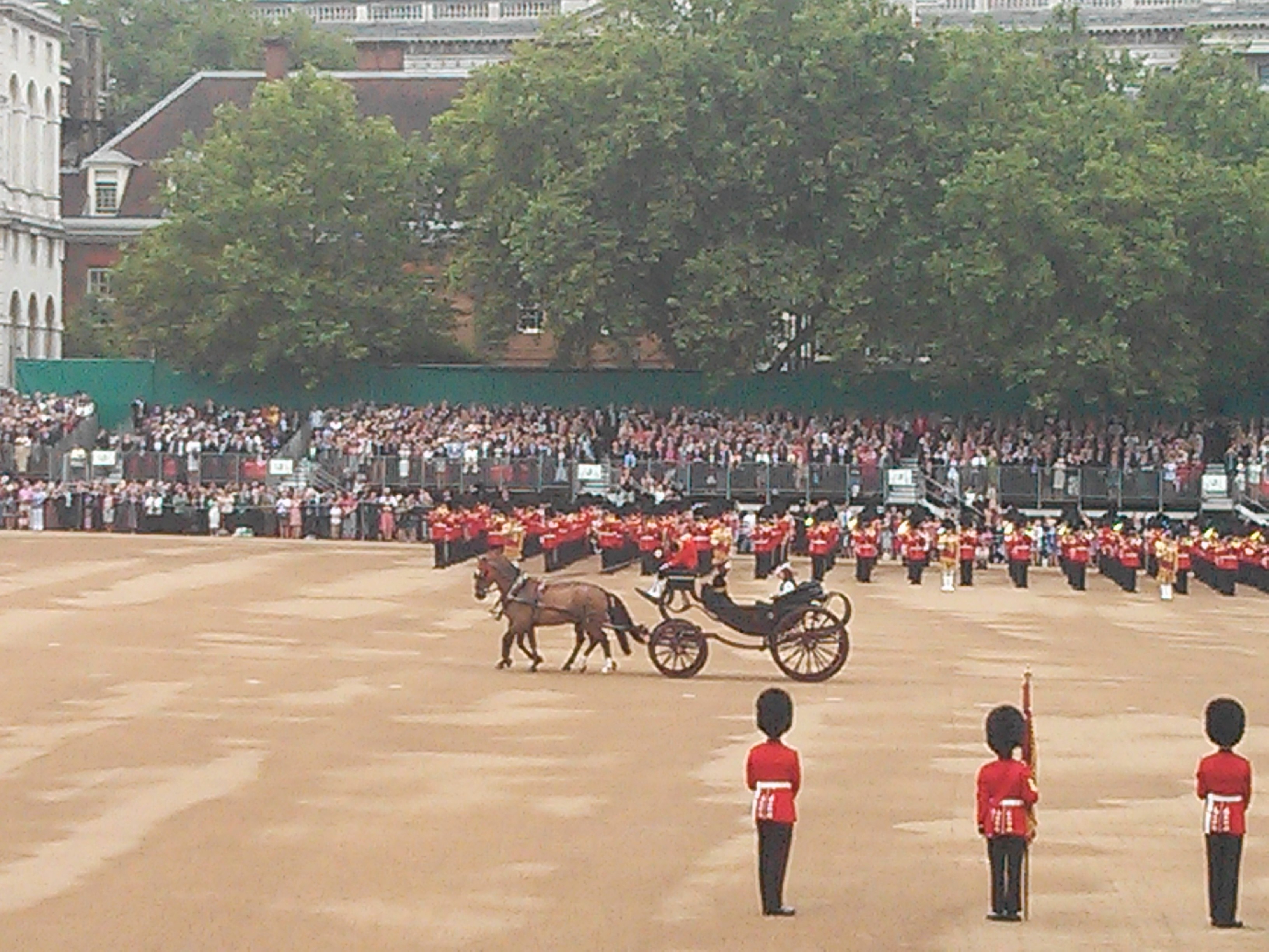 It was a pretty impressive sight to see British and Commonwealth armies performing to celebrate the official birthday of the British Sovereign (no matter what the Queen/Kings birthday they celebrate it in June when, “it’s more likely to be better British weather”) The whole Royal Family showed up and of course that meant I was most excited to see Kate (even without George) wizz by in a carriage.