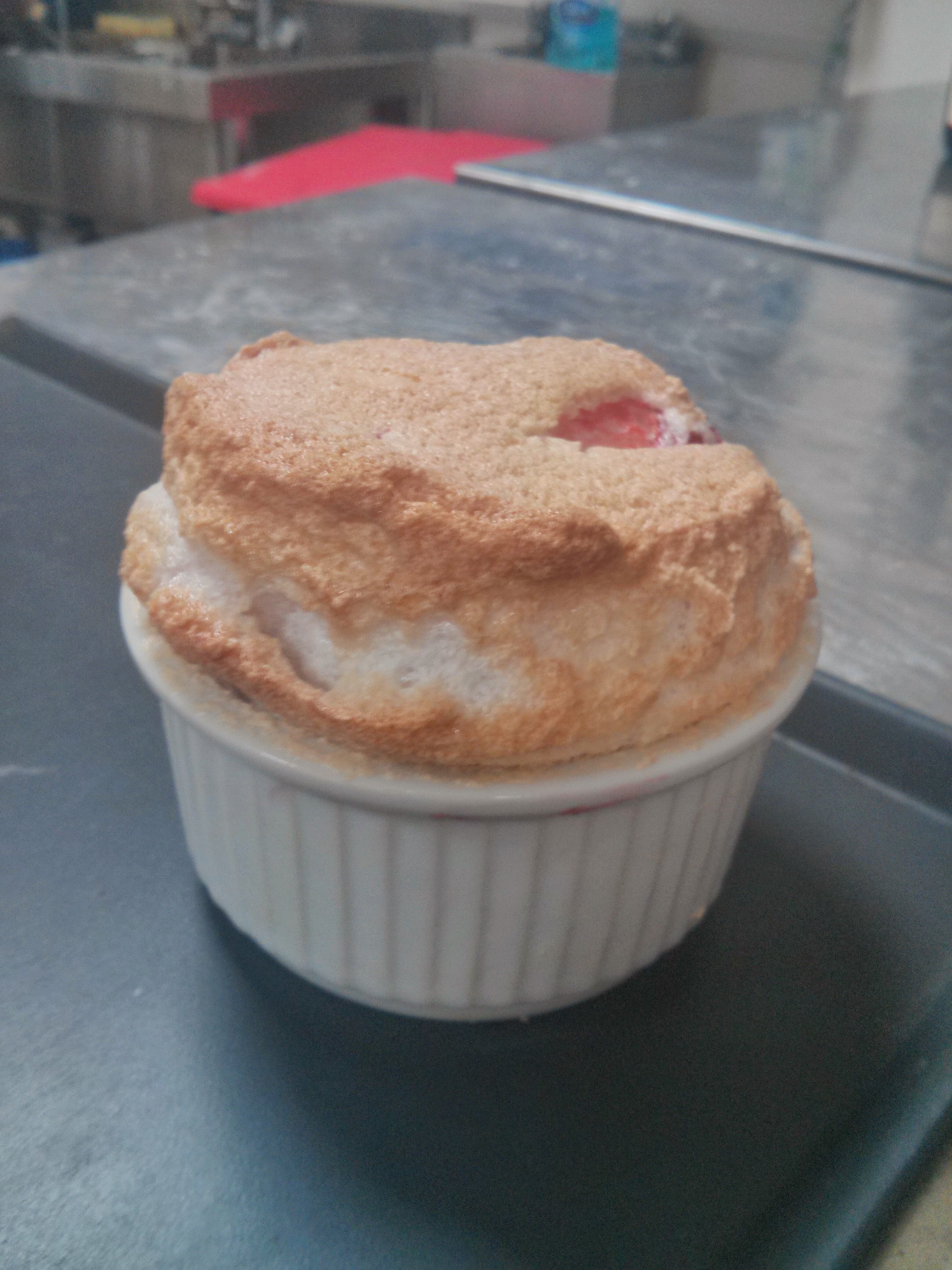 For pudding we made up an amazing Strawberry roulade. Not one to let food (sugar) go to waste, with the leftover meringue I made a charming little soufflé.