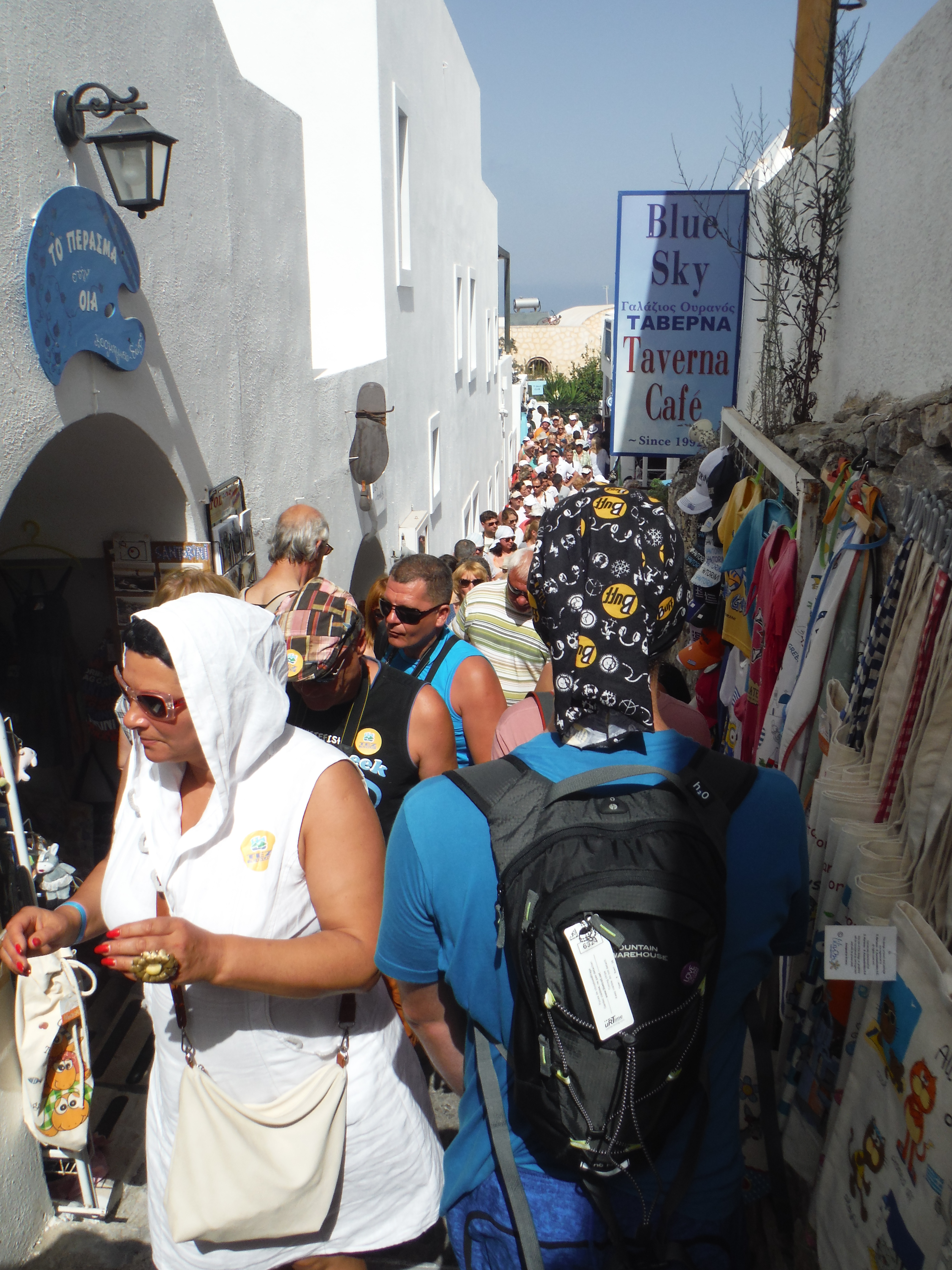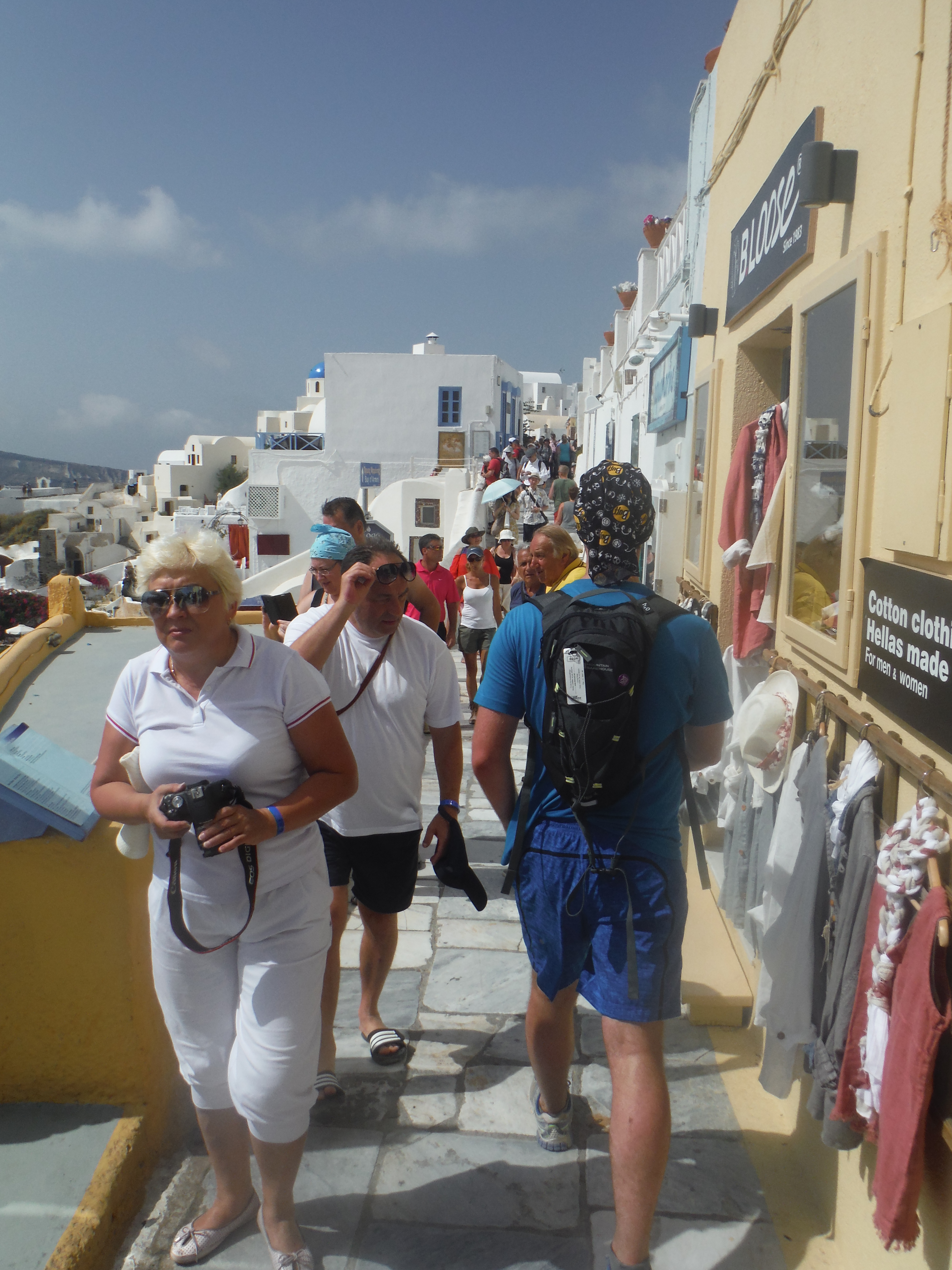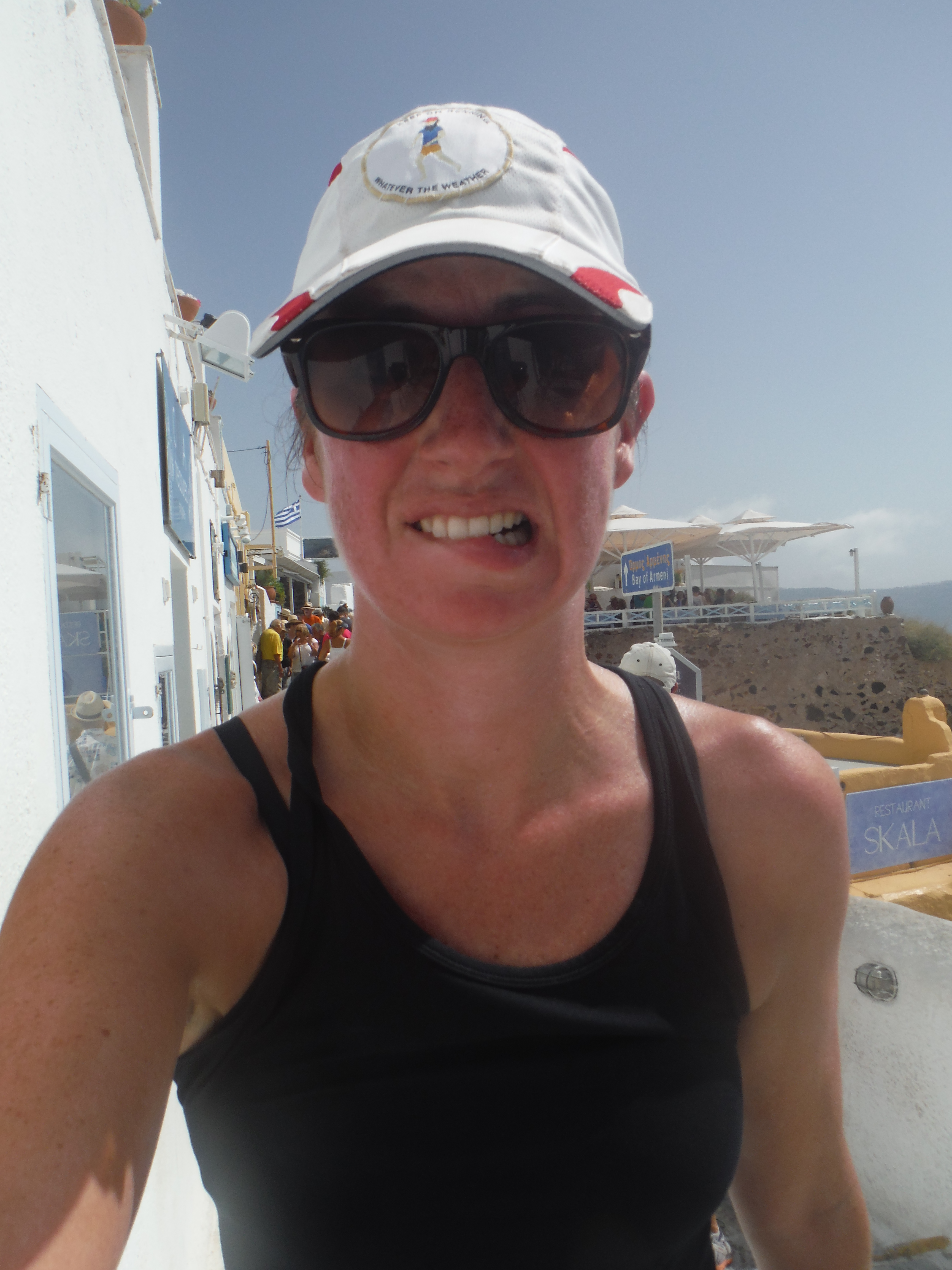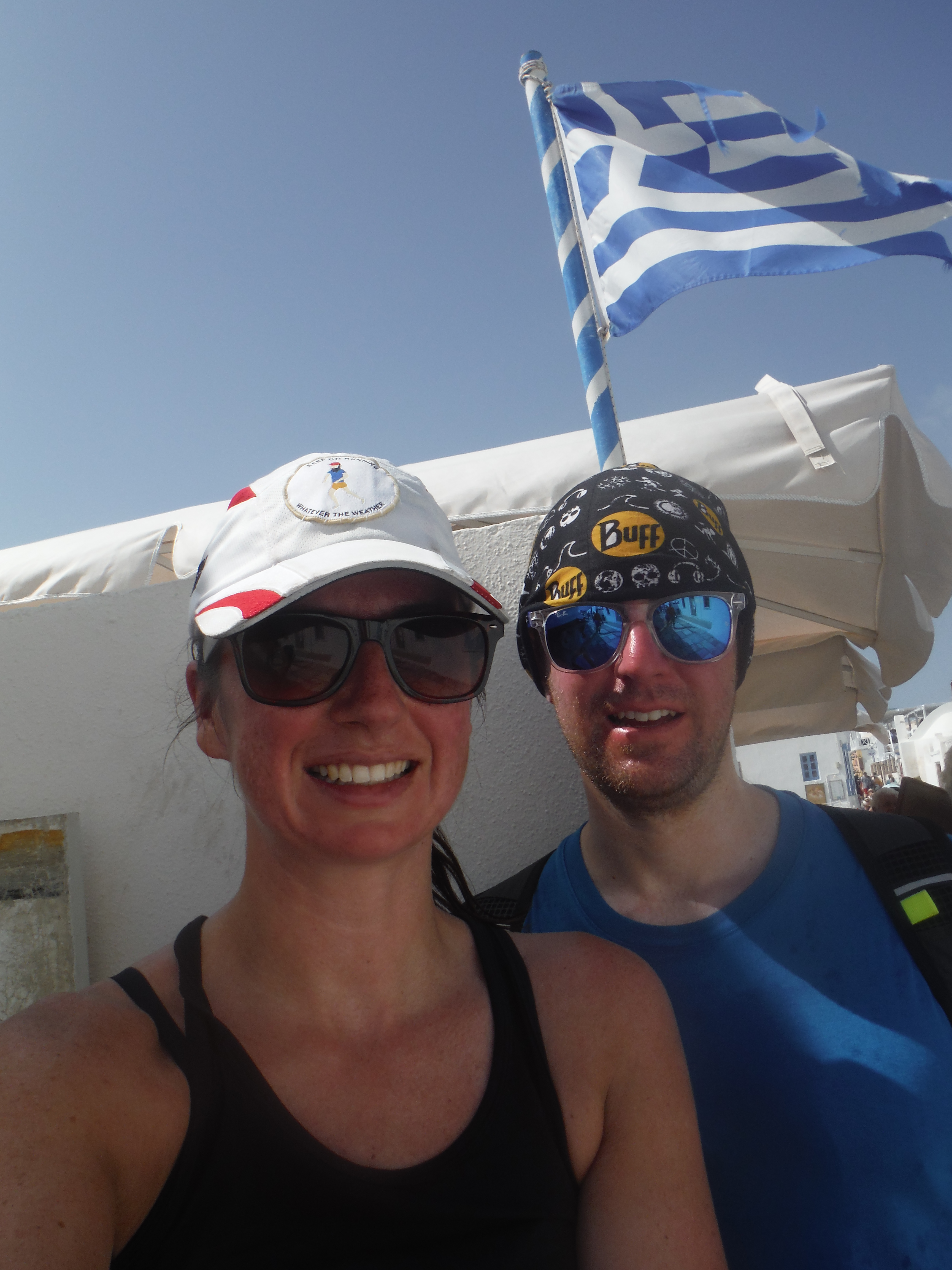 It was coming up on 11:30am when we reached Oia and the town was packed already. A quick flag selfie and we tried to keep running to our hotel but it was more like the London marathon than trail running at this point.