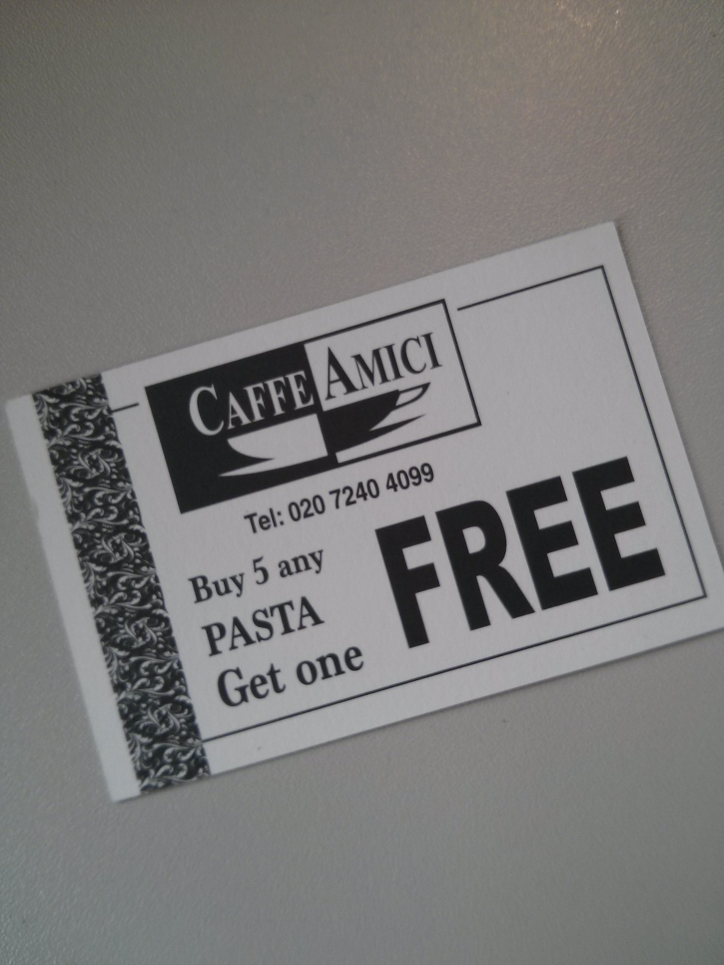 Picked up my pasta rewards card. The best pasta in WC2 is at Caffe Amici on Kingsway. The owner will make fun of your order, chastise you for using cards instead of cash, and engage you in deep philisophical questions while your pasta is being freshly prepared. Inspite of all this, he makes the best seafood penne pasta I’ve ever had and it’s the perfect Friday lunch to carb up for my marathon training weekend long runs.