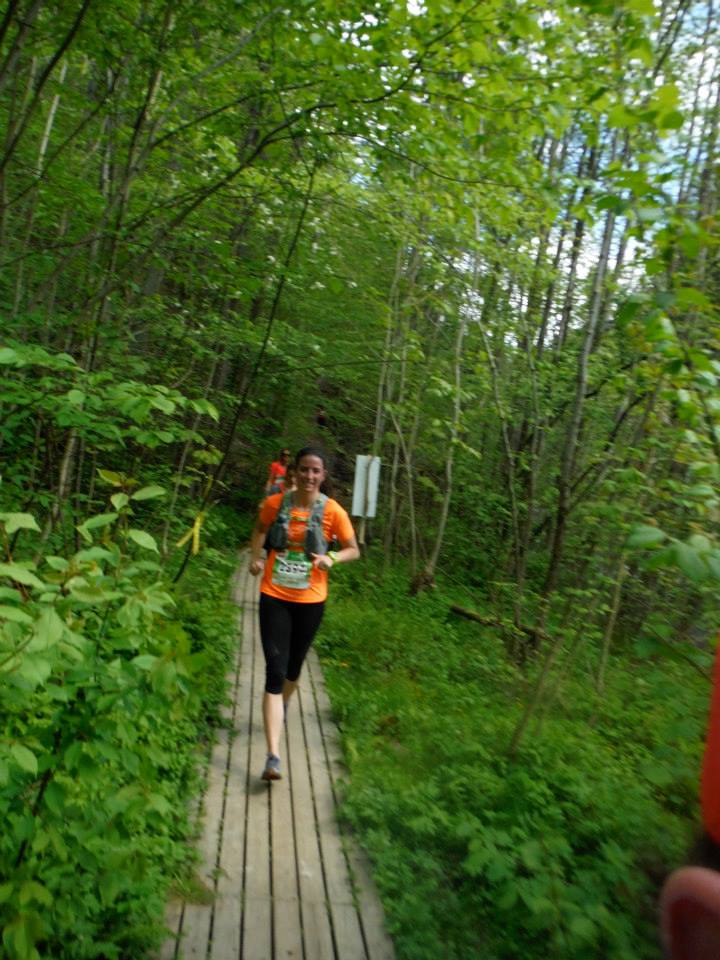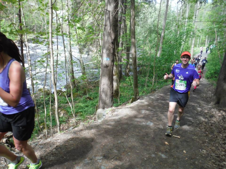 The first few km of the race were along a dirt/pavement path along a river and golf course.  We crossed a few bridges and saw some waterfalls and ran in and out of the forest back towards Oslo.  The next 4 km of the race were on technical trail. Not UTMB technical, but single track very short and steep (most inclines were above 30%) climbs.  Norwegian flat seems to mean going straight up and then straight down and then flat a bit and then repeat. I absolutely loved it and felt awesome on the trails. The last KM of trails started to feel a bit much in the ol’ bums & quads and I knew the rest of the race was going to be more painful than I thought.