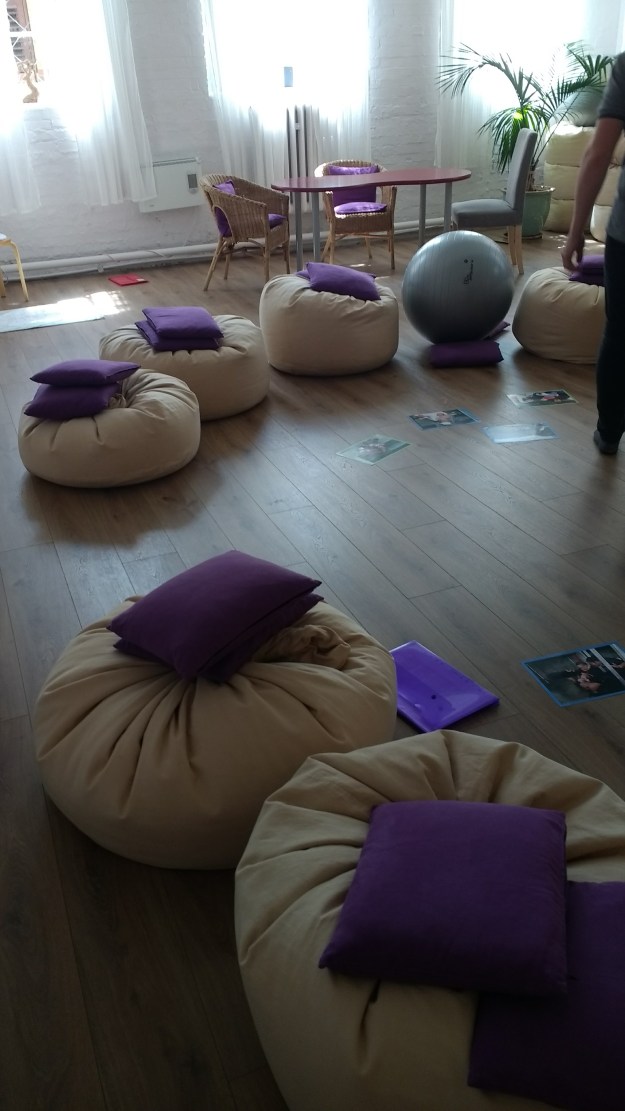 The class is taught by the centre founder Janet Balaskas, who has an impressive history of yoga, pregnancy, birth, and post-natal training. She was one of the first people to campaign the NHS to allow women to move around (and not be required to stay on a bed) during labour. There were about 20 people in the class (in the one I attended it was all pregnant women and their partners but all are welcome with any partner or not) and it took place in the impressively kitted out classroom that had every single yoga prop you could want. Finding a way to be comfortable during this class is not a problem.