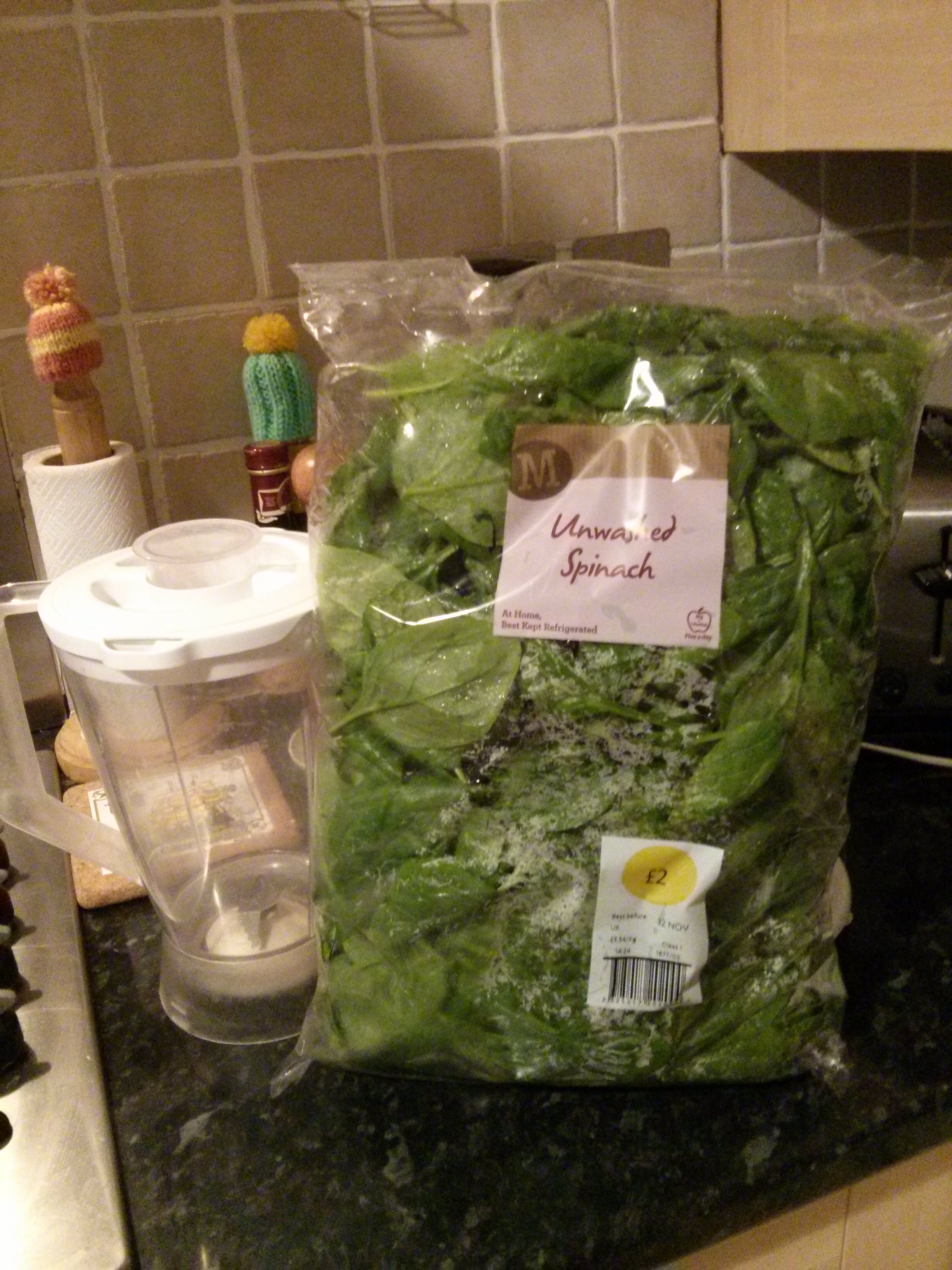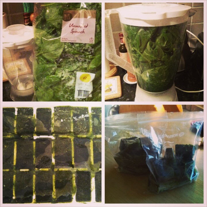 I bought the biggest bag of spinach in London at Morrisons the other day and decided to get lazy with it. After washing it I threw it in my cheap Argos blender with a bit of water and and made a spinach paste.  Poured into an icecube tray and left it to set over night.