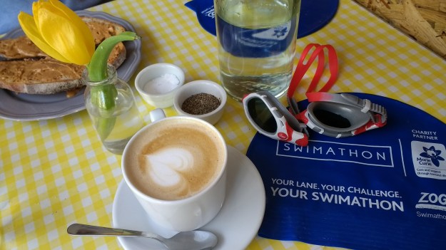 At the poolside we caught the swimathon staff cleaning up and they let us know we were 2 hours late to start. Oops. But being generally awesome swimmer people they took one look at us and said, “oh well, let’s get you ladies a lane.” We had to promise we’d count our own laps and not cheat while the organiser went out to get a croissant, but it was the perfect set up with Josie and I swimming American style (just me who calls it that?) up and down a side of our own lane.